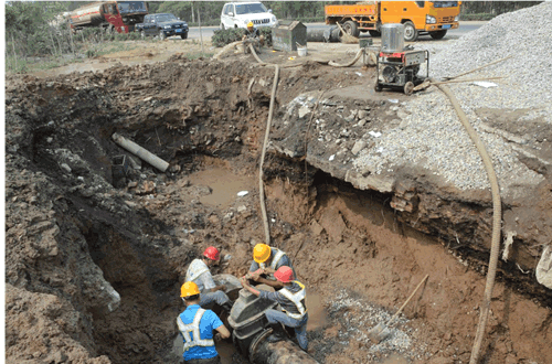 “在黃粱夢鎮(zhèn)新二中附近107國道路上,有清水從地下冒出來了!苯丈衔8點20分,自來水公司供水服務(wù)熱線3113771接到熱心市民電話反映,107國道路附近發(fā)生爆管且黃粱夢鎮(zhèn)水壓降低。接到這一消息后,自來水公司立即組織搶修人員趕往現(xiàn)場。經(jīng)搶修人員判定,是通往黃粱夢鎮(zhèn)直徑400毫米的輸水主管道發(fā)生爆管。通過現(xiàn)場勘察和利用管網(wǎng)地理信息系統(tǒng)定位,最終確定了輸水管道的受損點,并快速制定出搶修方案。從近日上午開始,自來水公司組織了20余人的搶修隊伍、2部搶修車輛、1臺大型挖掘機,兩臺發(fā)電機開始連續(xù)搶修。