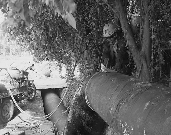 施工人員正在加緊焊接新給水管道。