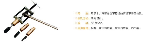 手動(dòng)不停水打孔機(jī)在建設(shè)、鋪設(shè)管道中,分支管道嫁接管道成為必不可少的工作,而對(duì)于各類材質(zhì)的管道進(jìn)行開孔則是首要問(wèn)題,聊城市鴻福管業(yè)有限公司生產(chǎn)的手動(dòng)不停水打孔機(jī)可以適用于國(guó)標(biāo)球鐵管、球墨管、水泥管、塑料管等材質(zhì)的管道,為管道建設(shè)作出了應(yīng)有的貢獻(xiàn)。手動(dòng)不停水打孔機(jī)開孔器主要是用于供水、煤氣、石油、化工等各種規(guī)格主管道的嫁接分支管道作業(yè)。