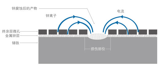 ● 損傷的自愈作用 噴鋅層的一個(gè)主要特點(diǎn)是能夠在損傷處自動(dòng)修補(bǔ)保護(hù)層,以保護(hù)保護(hù)層的完整。鋅離子通過密封毛孔(即瀝青漆涂料)遷移到損傷處填補(bǔ)傷口并轉(zhuǎn)變成穩(wěn)定的不可溶解的鋅化物。