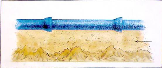 在多是石塊的土層情況下,為保護(hù)管子有條理地連續(xù)置放,應(yīng)考慮安裝層的問題(松軟土質(zhì)不必考慮)。安裝層由松軟的顆粒狀物質(zhì)組成(沙土、小碎細(xì)石粒、過篩土),其厚度應(yīng)保證底部距石塊層最小距離≮100㎜。見圖1