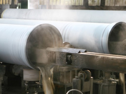 ●工藝簡(jiǎn)要:攪拌系統(tǒng)將一定比例的水泥、沙子和水進(jìn)行充分均勻的混合,再采用離心噴涂工藝將混合后的水泥涂覆到管道內(nèi)表面,可以得到壓實(shí)致密的、表面平整的水泥內(nèi)襯。水泥內(nèi)襯是球墨鑄鐵管常規(guī)的、典型的內(nèi)防腐形式。
